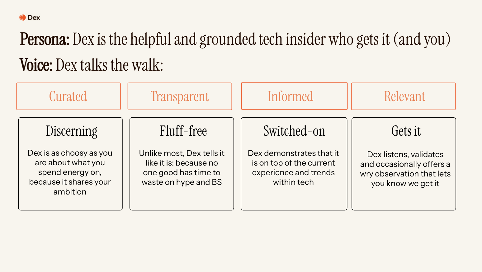 We spent time with our audience in one-to-one interviews, to understand their needs, pet peeves and real ambitions. This informed a brand platform that positioned Dex as a highly selective recruiter for ambitious talent - with no time for hype or fluff. We delivered a Brand Playbook with a brand voice stripped of corporate jargon, focusing on precision, utility, and high-level ambition.